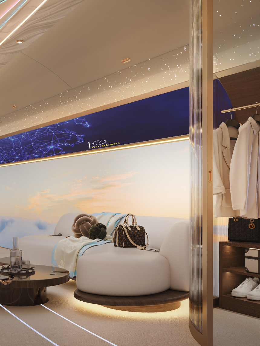 Imagine gliding through the clouds, cradled in a space where every detail is designed to embrace you. The Seraph’s private bedroom is an homage to tranquillity. A constellation ceiling twinkles softly, mirroring the vastness of the skies outside. Sunlight filters through sculpted windows, casting golden hues across luxurious bedding crafted with the finest textiles.